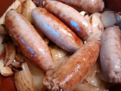 Make sure the pan has cooled a bit before the sausages go in, or they'll burst - turn it down, maybe take it off the heat for a minute or so. You want to brown the sausages all over, as best you can; I tend to be very mathematical about this and use tongs to get each quarter striped and try to line them up and get frustrated when they roll around, but you do it in whatever method you have devised.